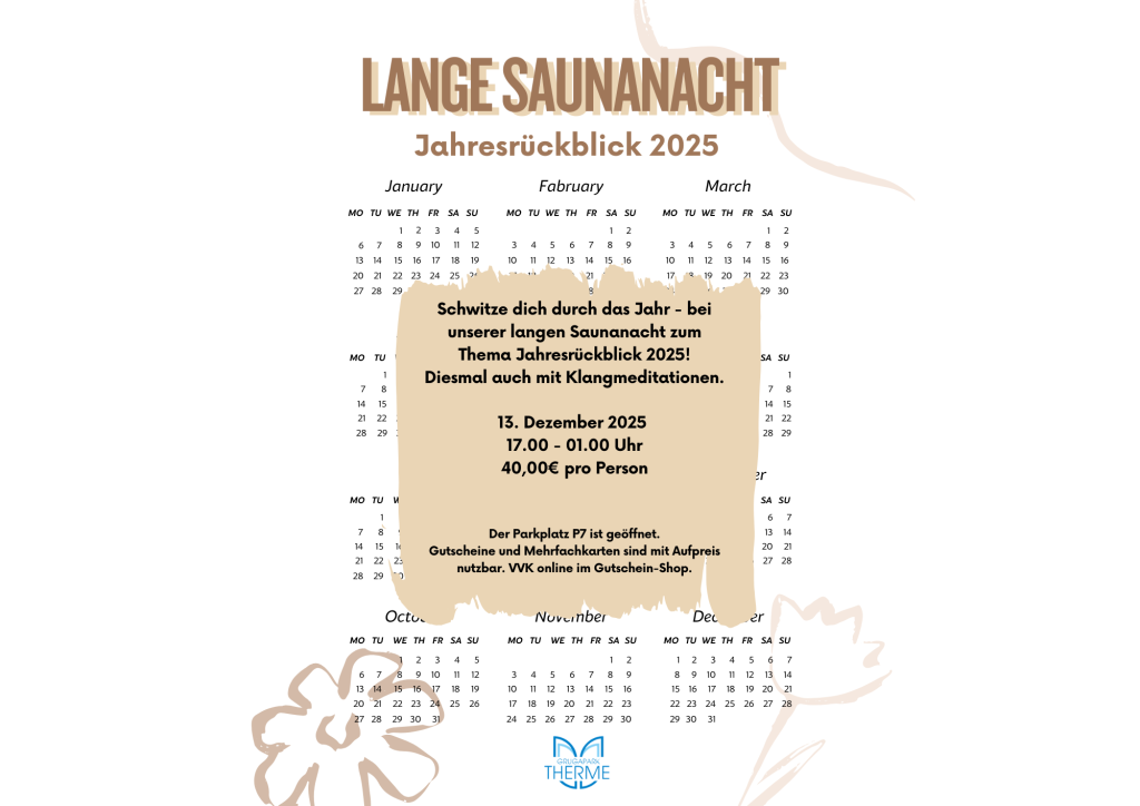 ✨ Schwitz dich durch das Jahr! Unsere lange Saunanacht 2025 wartet mit Klangmeditationen und vielen Wohlfühlmomenten. 🔥🧘♂️