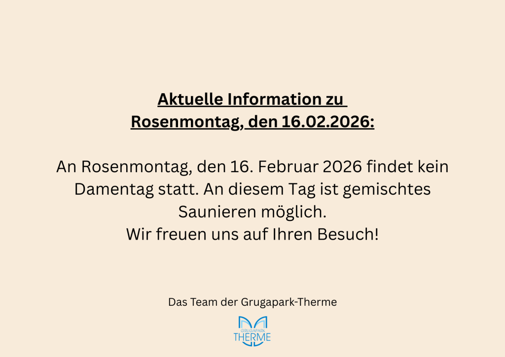 An Rosenmontag, den 16. Februar 2026 findet kein Damentag statt. An diesem Tag ist gemischtes Saunieren möglich.